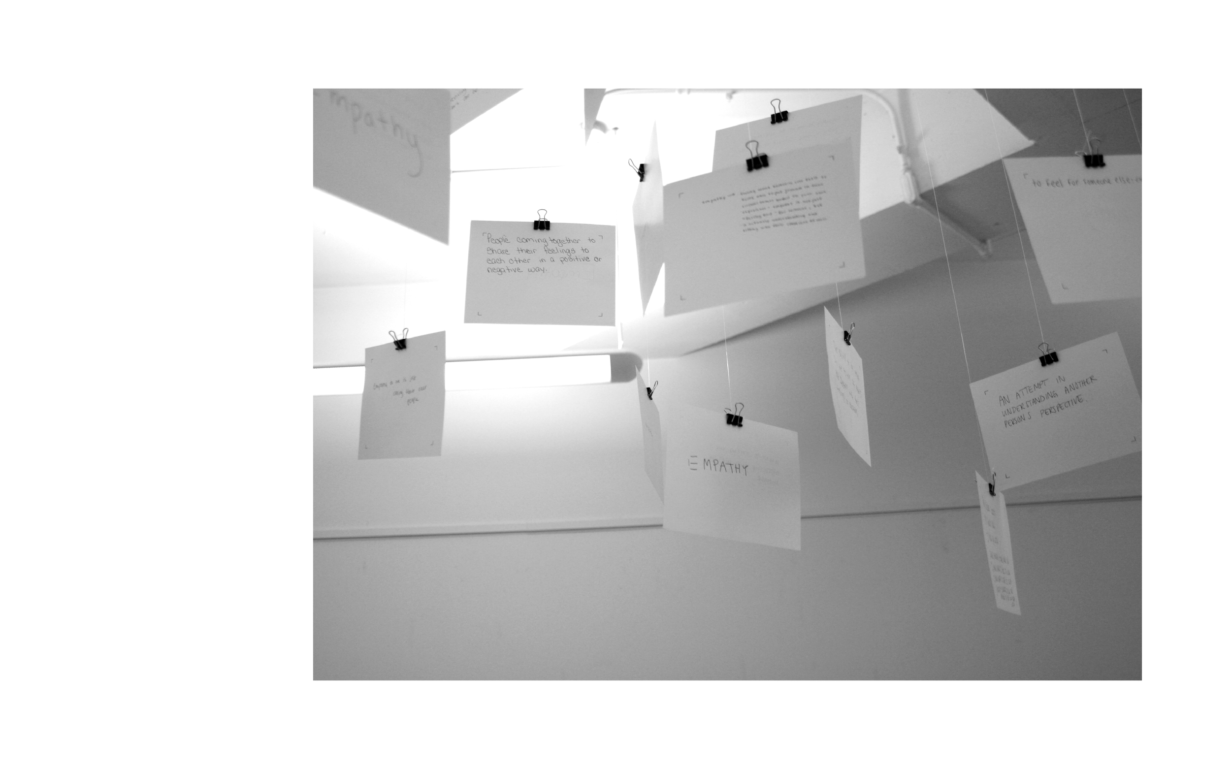 Our individual experiences are what make us, us. We all have our own unique story, something special to share. It is our uniqueness that connects us, makes us part of the collective whole. Our story is one within myriad stories that unite us. Separate as individuals, we stand as one. We all have a need to connect our individual stories with others. Empathy makes this possible. This project is an exercise in oneness. It is a collection of handwritten notes that describe and define empathy. They were collected from the people who surround me in daily life. Every explanation is different, no card is written the same. Each brings a new perspective to the word. Collectively they compose the word empathy; together they stand as one.